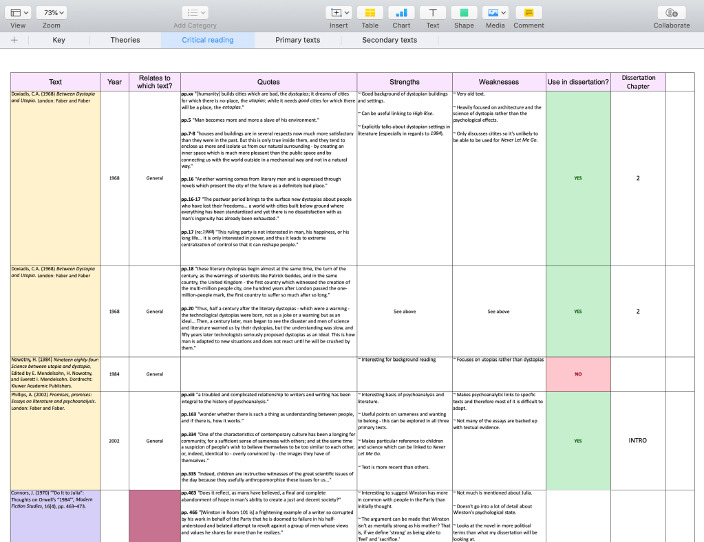 So, that’s what I did. I compiled all of my research onto a hefty spreadsheet. I separated each of the three areas onto a different sheet and then had columns identifying what book the quote related to; what theme it was related to; any comments or analysis I had; the strength and weaknesses of the theory or critic and what chapter of my dissertation it would be best in.
